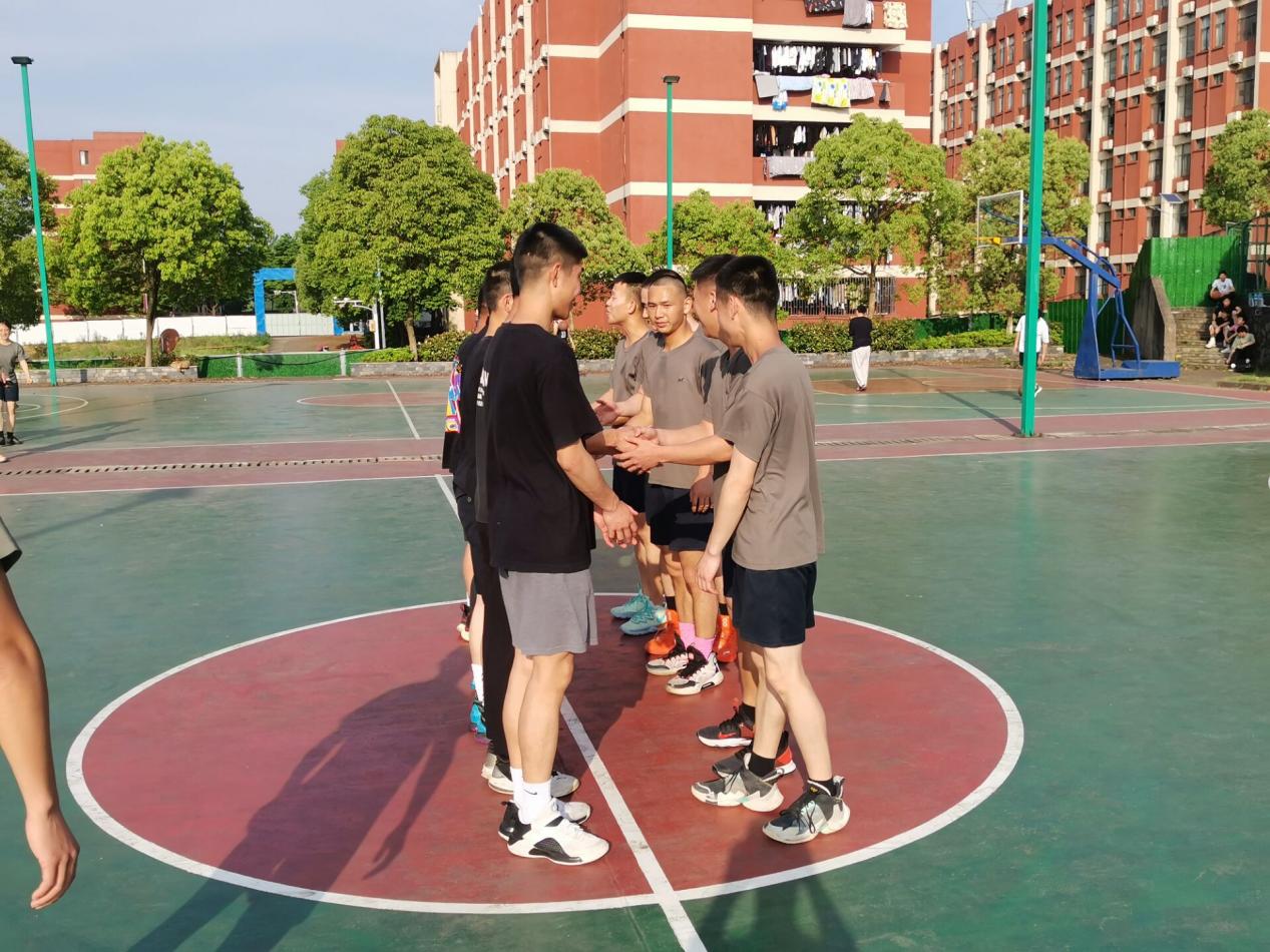 随着“新老教官双方就位准备开始”的哨音,新老教官队队员们纷纷走上篮球场中间,双方握手,加油打劲,比赛正式准备开始。